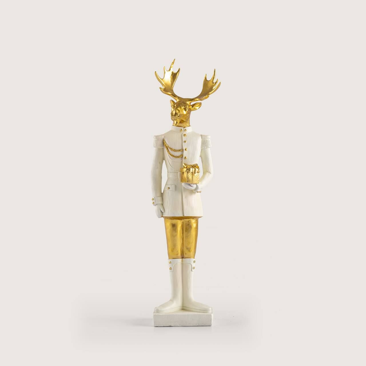 Klasik zarafeti modern bir mizahla buluşturan bu özel tasarım geyik figürü, altın ve beyazın asil uyumuyla yaşam alanlarınıza benzersiz bir hava katıyor. Üniformalı duruşu, elindeki hediye paketi ve detaylı işçiliğiyle dikkat çeken bu heykel; yılbaşı, kış dekorasyonu ya da tematik alanlarda güçlü bir vurgu ögesidir.
