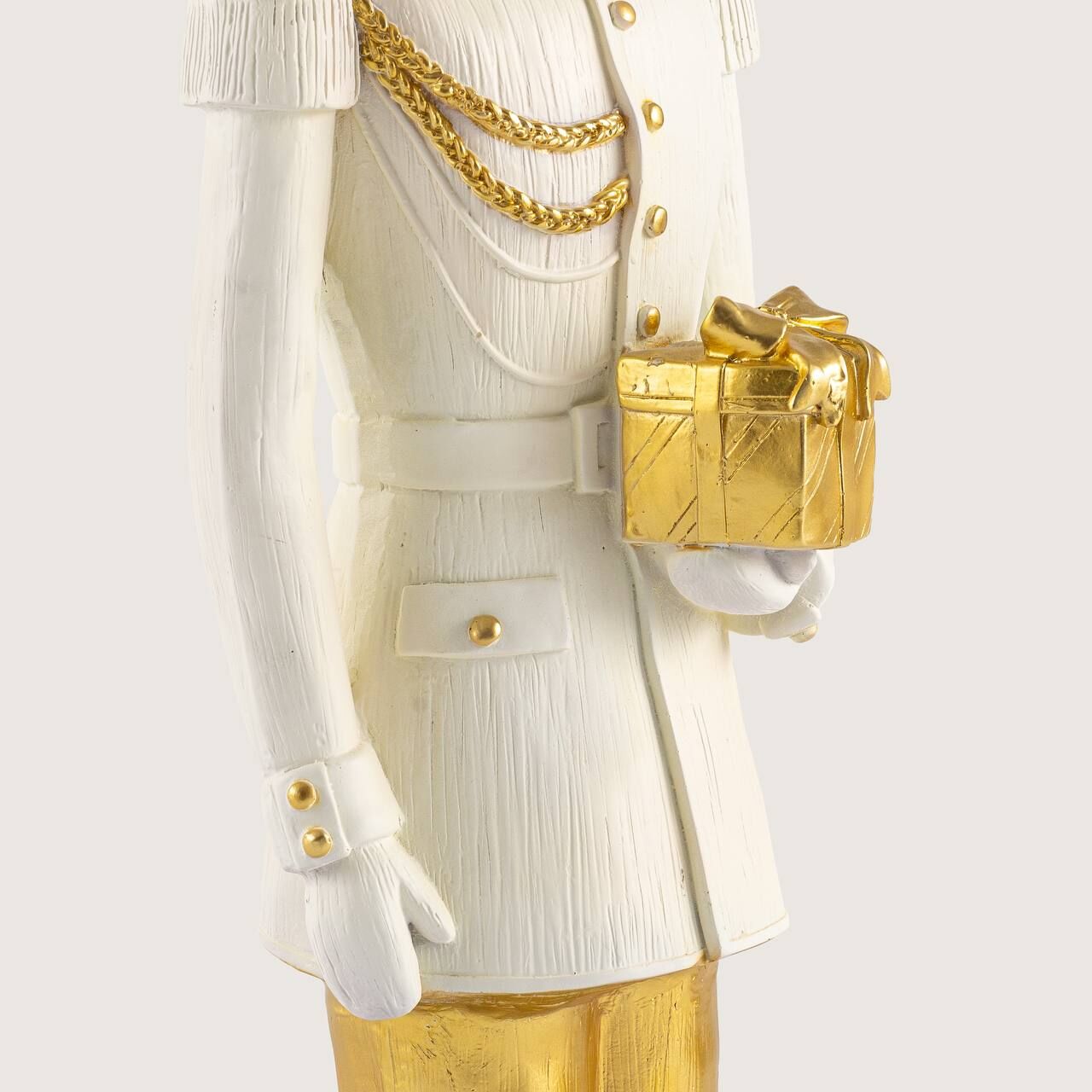 Gövdesindeki mat beyaz ton, metalik altın detaylarla zarifçe tamamlanmış; boynuzları, düğmeleri ve hediye paketi ışığı yansıtan göz alıcı bir etki sunar. Salon konsolları, şömine üzeri, giriş holleri ya da vitrin köşelerinde tek başına bir karakter gibi durur. Hem dekoratif hem de koleksiyon niteliği taşıyan özel bir parçadır.