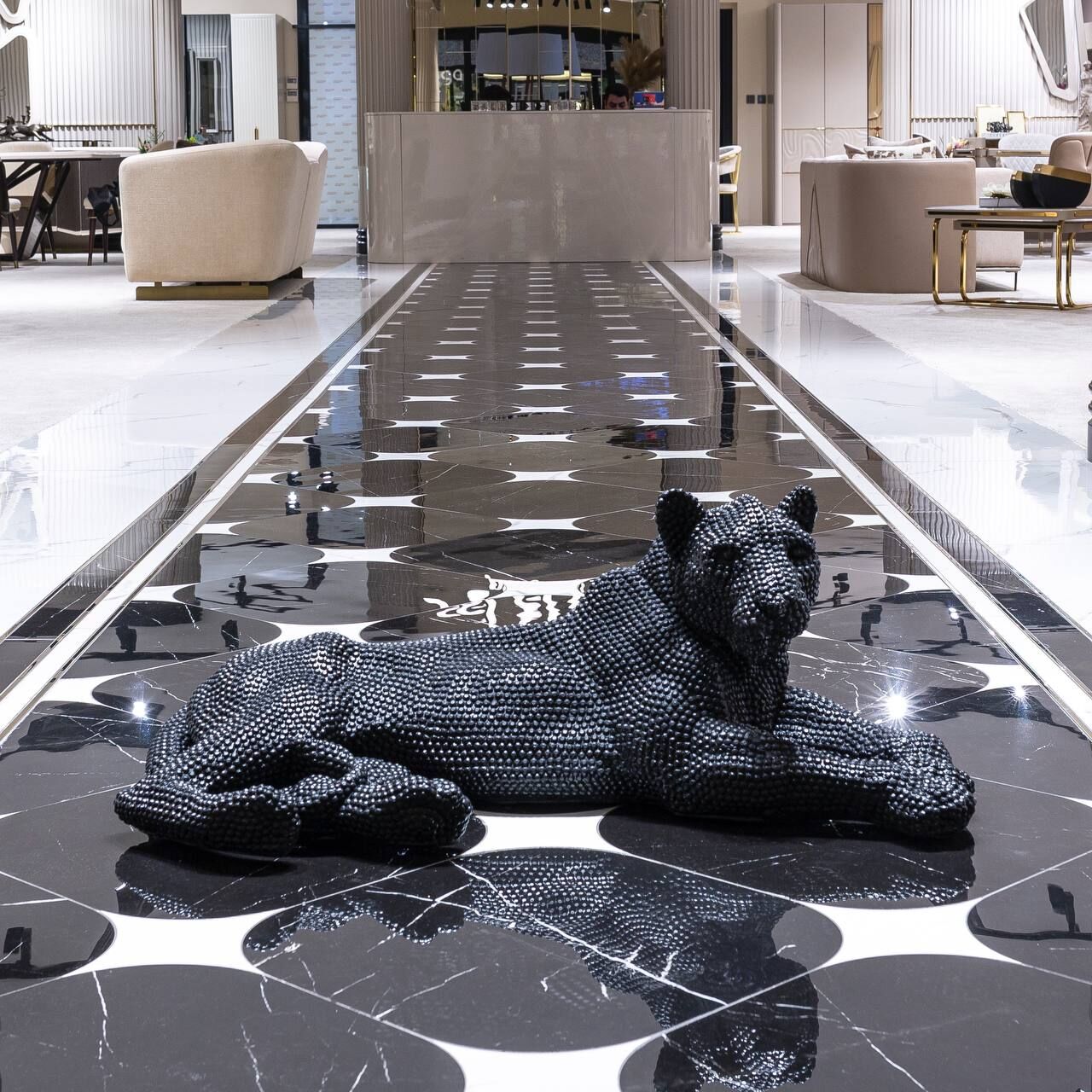 Gücün ve zarafetin simgesi panter figürü, bu özel tasarımda binlerce mikro taş dokusuyla hayat buluyor. Siyah renkteki kristal efektli yüzeyi sayesinde ışığı kırarak parıltılı bir görünüm sunan bu obje, bulunduğu ortamda sofistike bir vurgu yaratır. Yatış pozundaki asil duruşu ile hem dinamik hem de dingin bir atmosfer oluşturur. Sehpa, konsol ya da raf dekorasyonlarında iddialı bir dokunuş arayanlar için mükemmel bir tercihtir.